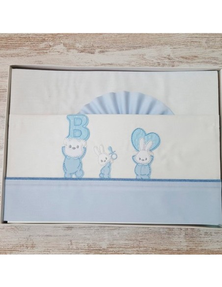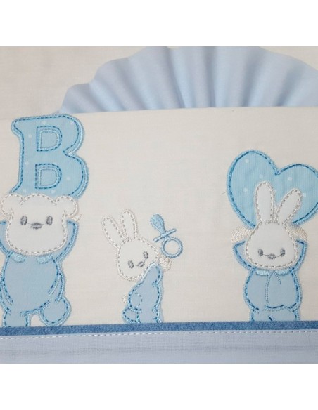 El juego de sábanas de minicuna de bebé e infantil está fabricado enteramente en tela de algodón 100%, con bonito dibujo de osito y conejitos bordados. Está compuesto por encimera, bajera y almohada. Está fabricado por la firma Duffi, símbolo de alta calidad.