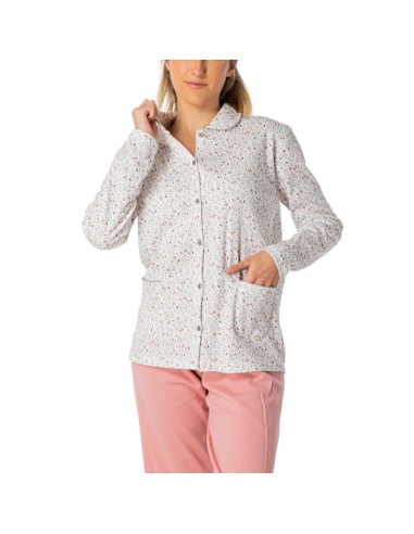 El Pijama abierto Victoria ha sido fabricado en suave punto de algodón, con cálido afelpado interior. La camiseta lleva una elegante estampación floral en rosa palo y verde kaki, sobre fondo blanco roto. El pantalón es liso, de color rosa palo. Ha sido fabricado por nuestra firma española de confianza Leniss, símbolo de muy alta calidad.